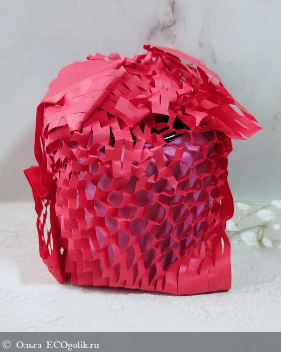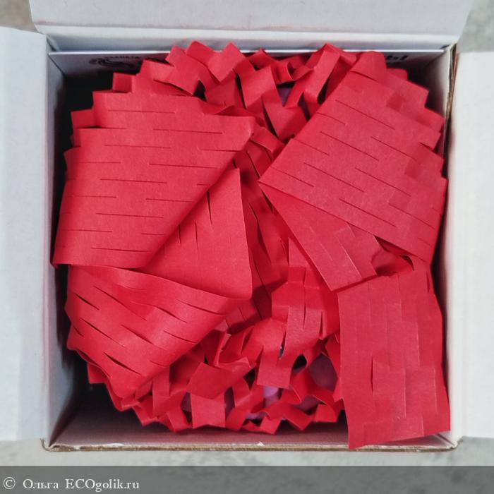 При открытии упаковки видно, что предмет завёрнут в специальную бумагу яркого красного цвета.