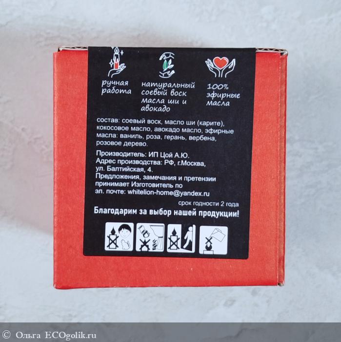 Меня сразу же привлёк её насыщенный красный цвет. Сбоку, на упаковке находится текст со всей необходимой информацией о свече.