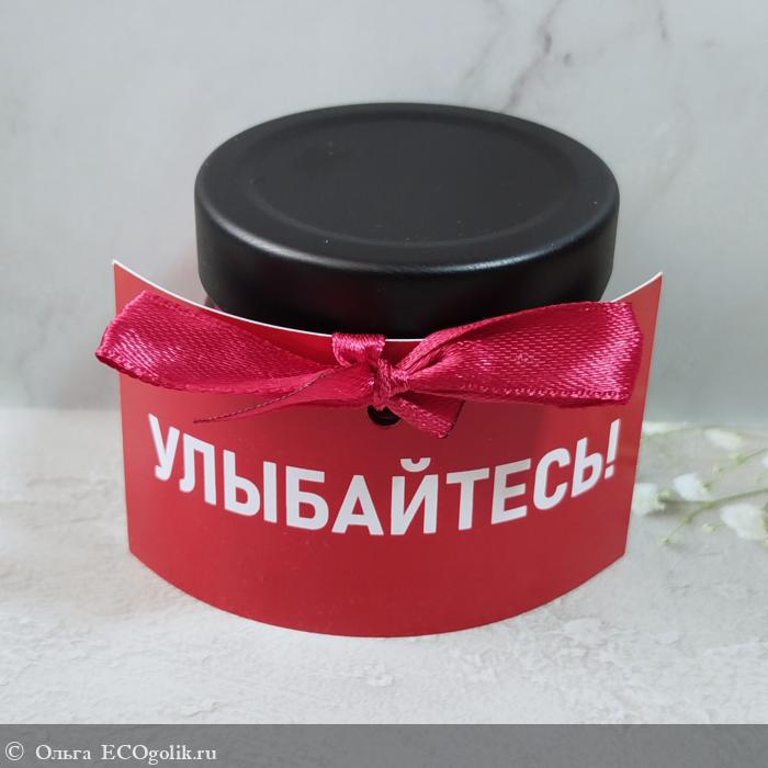 После снятия обёртки, можно увидеть баночку с изделием. С помощью ленточки к ней прикреплён кусочек картона с надписью: "УЛЫБАЙТЕСЬ!"