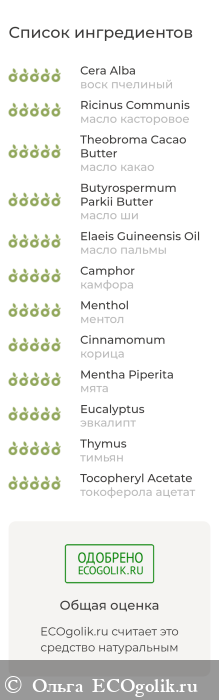 Уходовый продукт предназначен при первых симптомах простуды, обладает лёгкими разогревающими свойствами, а также смягчает дыхательные пути при насморке. По сути, данный бальзам это аналог знаменитой "Звёздочки", только с более деликатным действием.