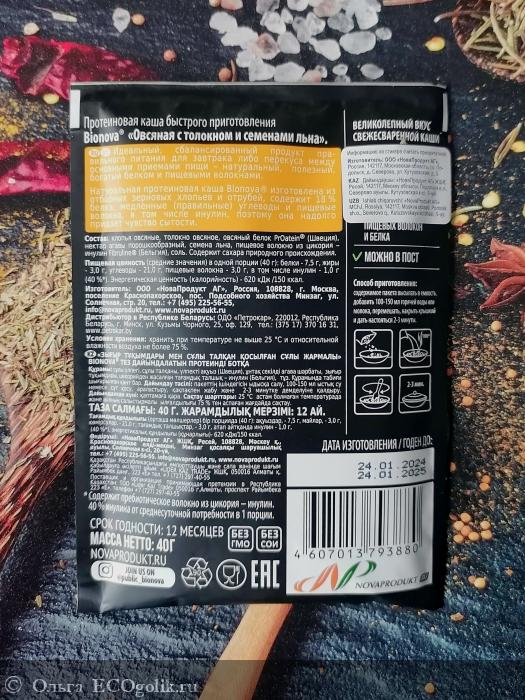 На обратной стороне упаковки находится текст со всей необходимой информацией о протеиновой овсяной каше. Отдельно стоит отметить превосходное качество печати.