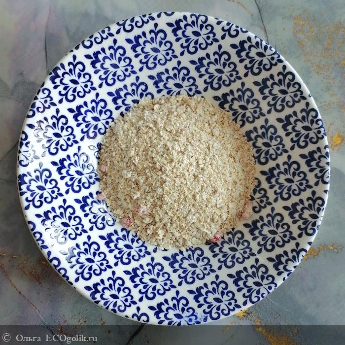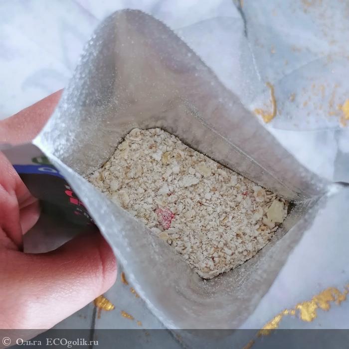 В субстанции, кроме овсяных хлопьев, видно кусочки сушёной клубники.