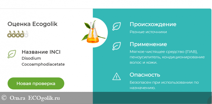 Экоголик не распознал ингредиент - кокамфодиацетат динатрия, который на сайте производителя и на упаковке указан с опечаткой! Судя по всему - это