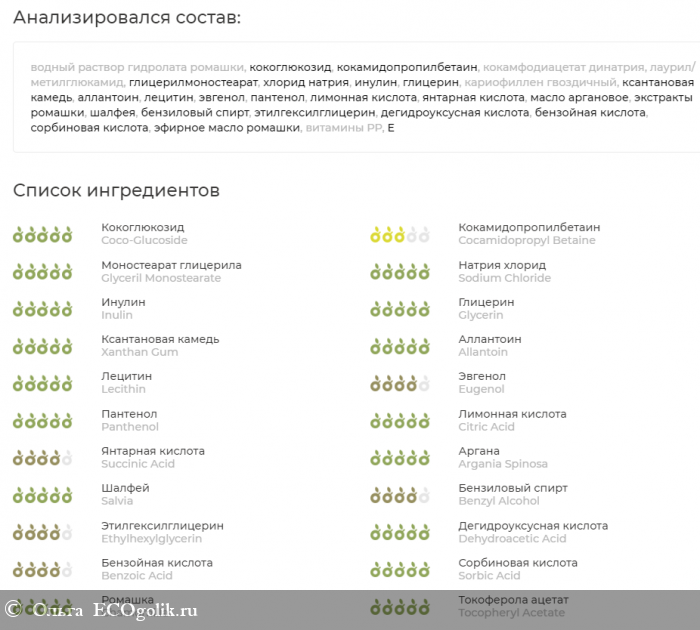 Состав: водный раствор гидролата ромашки, кокоглюкозид, кокамидопропилбетаин (производные кокосового масла), кокамфодиацетат динатрия, лаурил/метилглюкамид, глицерилмоностеарат, хлорид натрия, инулин, глицерин, кариофиллен гвоздичный, ксантановая камедь, аллантоин, лецитин, эвгенол, пантенол, лимонная кислота, янтарная кислота, масло аргановое, экстракты ромашки, шалфея, бензиловый спирт, этилгексилглицерин, дегидроуксусная кислота, бензойная кислота, сорбиновая кислота, эфирное масло ромашки, витамины РР, Е.