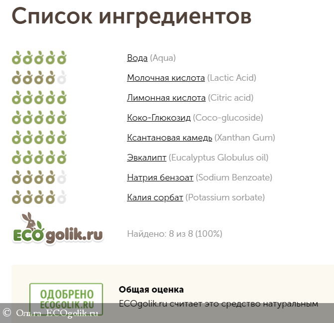 Состав: Aqua (Вода), Lactic Acid (Молочная кислота), Citric acid (Лимонная кислота), Coco-glucoside (Мягкий ПАВ из кокосового масла), Xanthan Gum (Ксантановая камедь), Eucalyptus Globulus oil (Эфирное масло эвкалипта), Sodium Benzoate (Бензоат натрия), Potassium sorbate (Сорбат калия).
