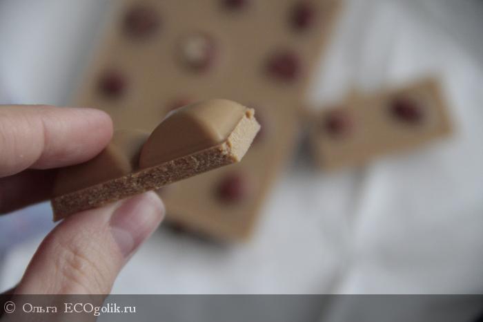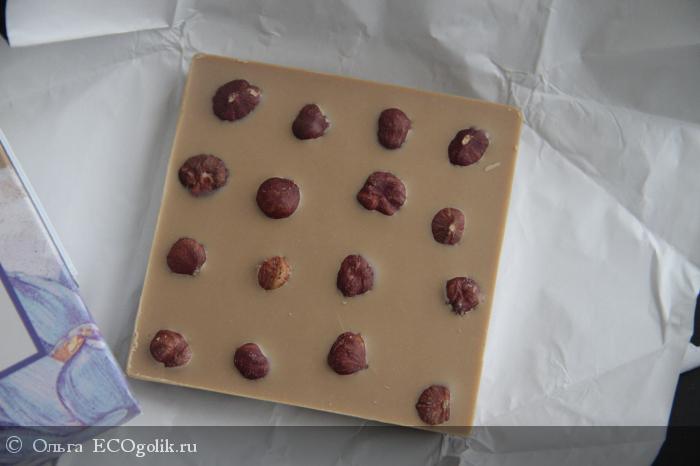Кроме того, хочу отметить тот факт, что плитка устроена таким образом, что в каждом кусочке вас ждет фундук. Это отличное решение, так как полная симфония вкуса случается именно про разгрызании орешка, если бы орех был дробленный его тонкий вкус окончательно смешался с самими шоколадом, утонув в упомянутой какофонии. Шоколад интересный , но поскольку гастрономический экстаз не случился, не знаю насколько он стоит вашего внимания. Я второй раз брать не буду