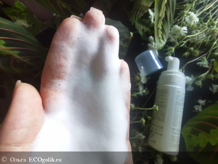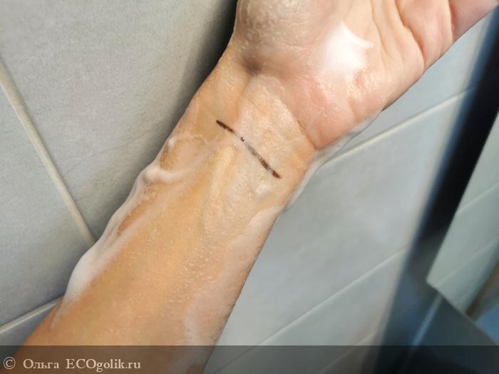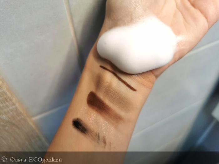 На руке : тон ( на него пенка спустилась почти на весь на фото), карандаш для глаз ( довольно жирный , его и мицелярка не всякая берет), минеральные тени, тушь. Ну и 1 нажатие пенки