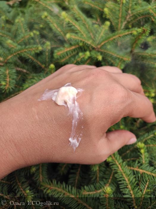 Нежный крем хорошо распределяется, легко впитывается, придаёт приятное ощущение бархатной кожи без липкости и жирного блеска"
