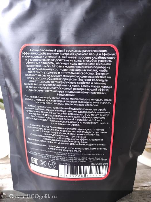 Несмотря на (в моём случае) слабый разогревающий эффект, скраб мне понравился, так как антицеллюлитным действием он всё таки обладает.