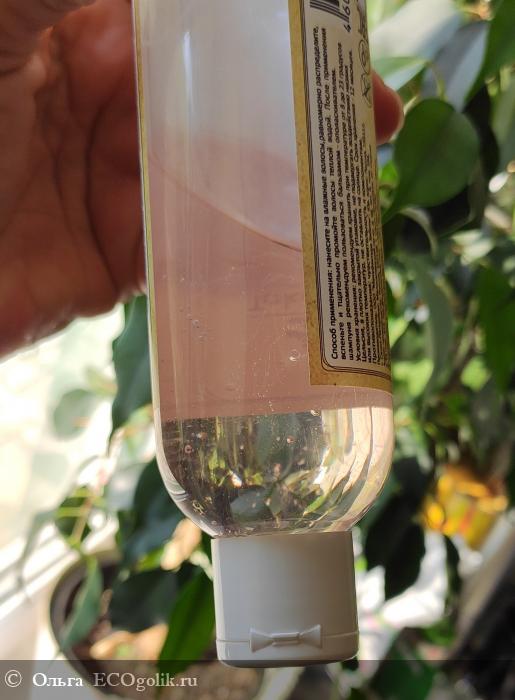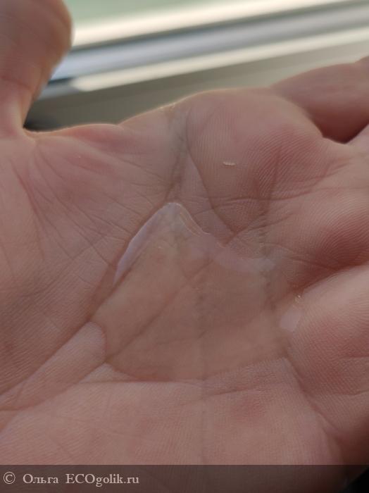 Консистенция гелевая средней густоты. С рук не убегает, но взгляд мужа, можно было и погуще. Для меня густота не принципиальна. Главное моё требование, чтобы это была не вода и порция не убегала с рук. Мне кажется, данная консистенция идеальна. Это всё таки тягучий гель, а не водичка и не желе. При наклоне руки сползает медленно.