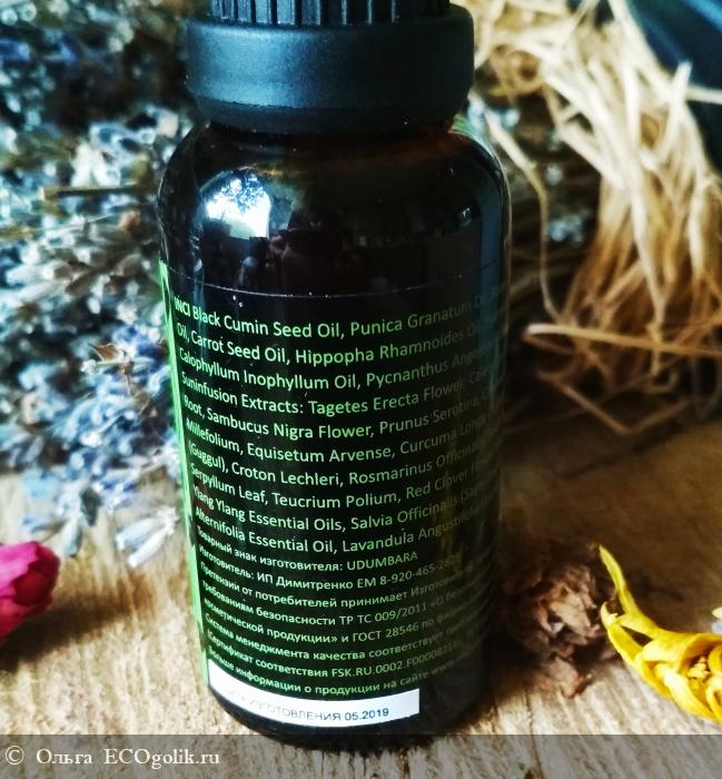 INCI: Black Cumin Seed Oil, Punica Granatum Oil**, Rosa Canina (Rosehip) Fruit Seed Oil**, Carrot Seed Oil, Нippopha Rhamnoides Oil, Hydnocarpus Laurifolia Oil, Calophyllum Inophyllum Oil, Pycnanthus Angolensis Oil, Sesame Seed Oil**, suninfusion extracts***: Tagetes Erecta Flower, Calendula Officinalis, Glycyrrhiza Glabra Root, Sambucus Nigra Flower, Prunus Serotina, Chamomilla Recutita Flower, Achillea Millefolium, Equisetum Arvense, Curcuma Longa (Turmeric), Commiphora Mukul (Guggul), Croton Lechleri, Rosmarinus Officinalis, Salvia Officinalis (Sage), Thymus Serpyllum Leaf, Teucrium Polium, Red Clover Flower Extact, Ylang Ylang Essential Oils*, Salvia Officinalis (Sage) Essential Oil*, Melaleuca Alternifolia Essential Oil*, Lavandula Angustifolia Essential Oil*.