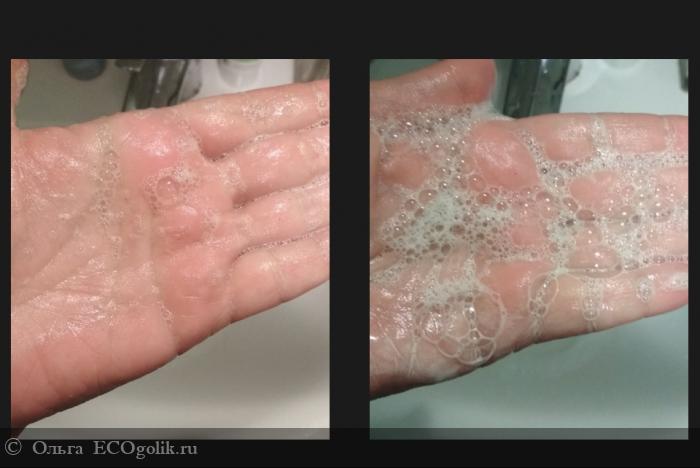 В руках шампунь не пенился категорически, на волосах только с третьего раза и то сла́бо. Такое со мной впервые, так как обычно все шампуни пенятся с первого раза. При намыливании белые частички сильно цепляли и путали волосы, к тому же царапая кожу. Я могу это объяснить тем, что основа шампуня смыливалась быстрее этой белой стружки.
