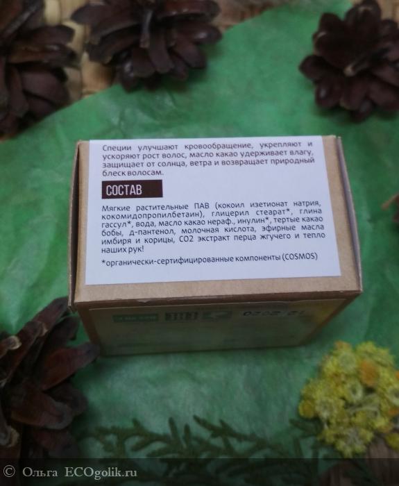мягкие растительные ПАВ (кокоил изетионат натрия, кокомидопропилбетаин), глицерил стеарат*, глина гассул*, вода, нерафинированное масло какао, инулин*, тертые какао бобы, д-пантенол, молочная кислота, эфирные масла имбиря и корицы, СО2 экстракт перца жгучего и тепло наших рук! *органически-сертифицированные компоненты (COSMOS)