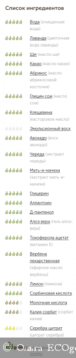 очищенная вода, цветочная вода лаванды, масло ши, масло какао, масло абрикосовой косточки, масло сои, касторовое масло, эмульсионный воск, воск авокадо, экстракт череды, экстракт мать-и-мачехи, глицерин, аллантоин, д-пантенол, гель алоэ-вера, витамин E, эфирное масло вербены и лимона, сорбиновая кислота, молочная кислота, сорбат калия, цитрат серебра