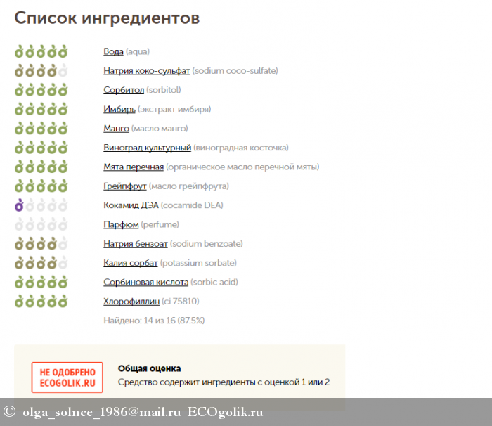 И так, был изучен состав, указанный производителем: aqua, sodium coco-sulfate, sorbitol, органическое масло какао, экстракт имбиря, масло манго, виноградная косточка, абрикосовая косточка, органическое масло перечной мяты, масло грейпфрута, cocamide DEA, perfume,sodium benzoate, potassium sorbate, sorbic acid, ci 75810