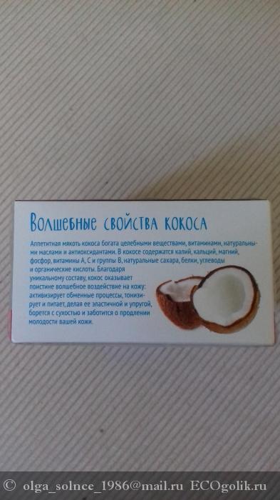 кокосовая стружка, морская соль, кокосовое масло, глицерил моностеарат, сорбитан оливат, вода подготовленная, кокамидопропилбетаин, кокоглюкозид, олеиновая кислота, лимонен, янтарная кислота,сорбитан каприлат, витамин Е, масло ши, экстракт кокоса, экстракт абрикоса, экстракт красного винограда, ягоды винограда темных сортов измельченные, эфирные масла нероли, герани, апельсина, кармин.