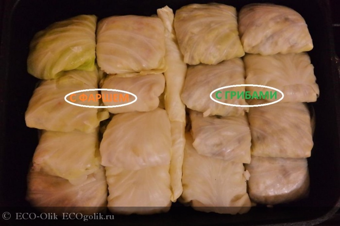 Фарш свино-говяжий. Тоже к продукту нет никаких претензий, фарш свежий, в нем не воды (как это иногда бывает). Половину фарша я решила пустить на голубцы. Приготовила восемь голубцов мясных для мужа и восемь грибных для себя. Вот как я это делала: отварила капусту, разобрала на листья и срезала твердые места. Обжарила лук, добавила к нему фарш и затем соль и другие специи. Когда фарш был готов, я всыпала туда заранее приготовленный рис, все тщательно перемешала и через пару минут выключила огонь. Полученную начинку я распределила по листьям капусты, сформовала голубцы. Себе сделала то же самое только с грибами. Потом я взяла противень, смазала маслом, нашинковала немного капусты и уложила на нее голубцы. Сверху залила томатным соком со сметаной. Затем отправила в духовку на полчаса. Получилось очень вкусно. И мне, и мужу понравилось. Фарш тоже получает твердую пятерку (5 БАЛЛОВ).
