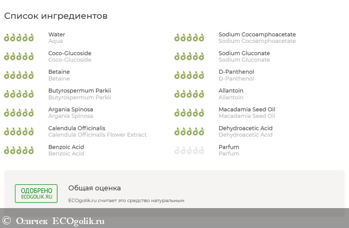 Пользоваться пенкой можно с рождения. Она имеет физиологичный pH – 5.5. 99,9% компонентов имеют природное происхождение. Безопасность продукта подтверждена анализом сервиса состава Экоголик. В пенке нет парабенов, сульфатов, минеральных масел, а также фталатов, агрессивных отдушек, которые могут вызвать реакцию на коже. Есть успокаивающие детскую кожу ингредиенты – календула, бетаин, пантенол и другие. Питательные компоненты тоже присутствуют – масло ши, масло арганы, масло макадамии.