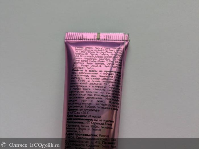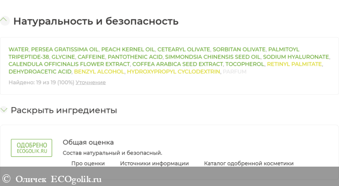 Во-первых, состав полностью одобрен. На основе пептидов из морских водорослей. Много разных активов – они на скрине. Все хороши для зоны под глазами. Все они рабочие как против отеков, так и против морщин. Это и зеленый кофе, и масло жожоба, и гиалуроновая кислота. Не только против отеков, но и против потери тургора, а также против морщин и кругов.