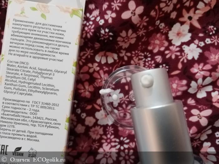 Состав просто ударный против несовершенств кожи. Это чайное дерево, тимьян, азелаиновая кислота. При этом в крем не добавлены вредные спирты или силиконы. Состав прошел чек и получил одобрение самого строгого в этом плане сервиса – Экоголика.