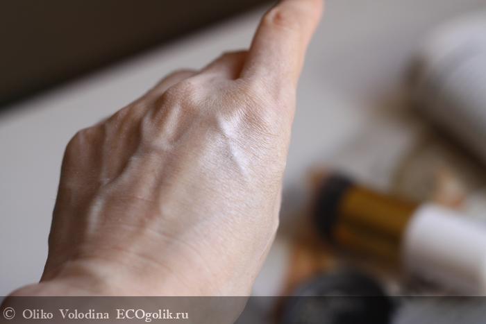 Растушевывается при сухом нанесении тонко, выравнивая тон, но не выбеливает сильно.