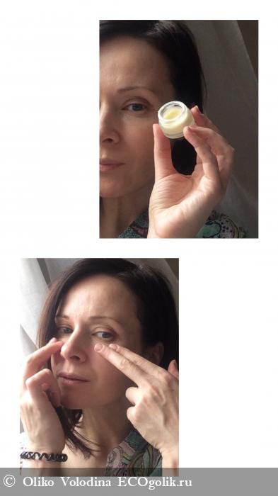 Я беру подушечкой среднего пальца крем — он прилипает сам столько сколько есть и этой дозы вполне хватает на зону век.