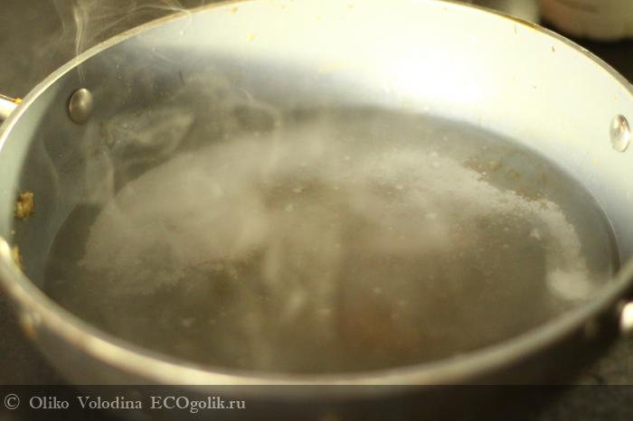 Я заливаю горячей водой. Чем горячее, тем активнее реакция, быстро идет растворение.