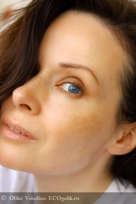 Далее я использовала минеральный макияж, и мне очень нравится сочетание такого липидного по текстуре крема и сухой пудры. Пудра не проваливается в рельеф и ложится гладко, не подчеркивает морщинки.