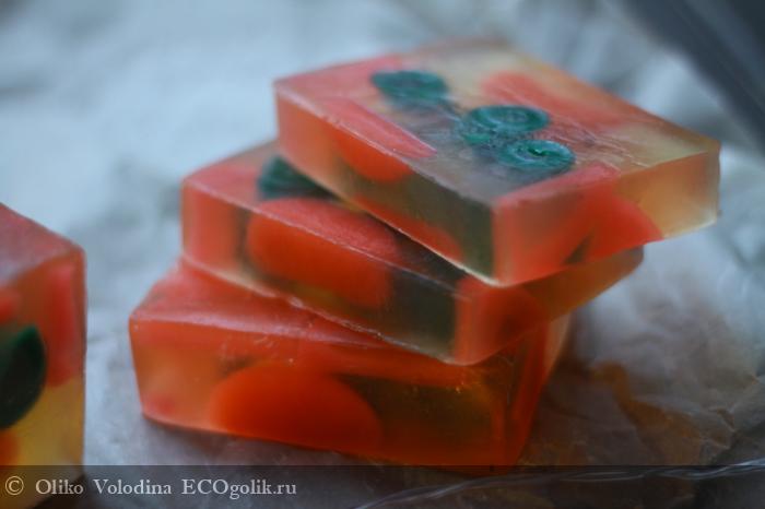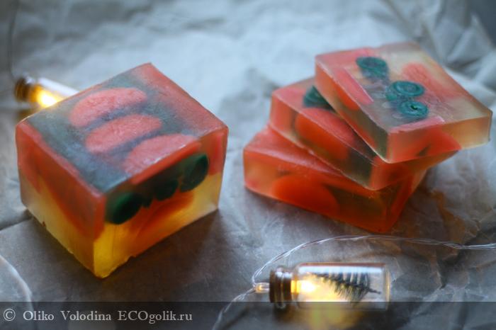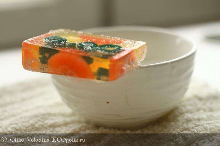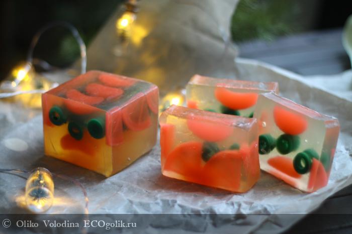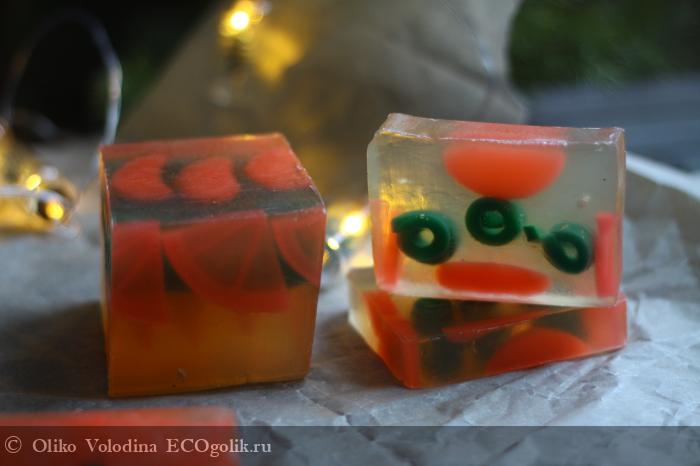 Выглядит мыло интересно – внутри дольки мандарина и как сказала, одна девочка, оливки J. Все это наводит на мысли о празднике и автоматически поднимает настроение.