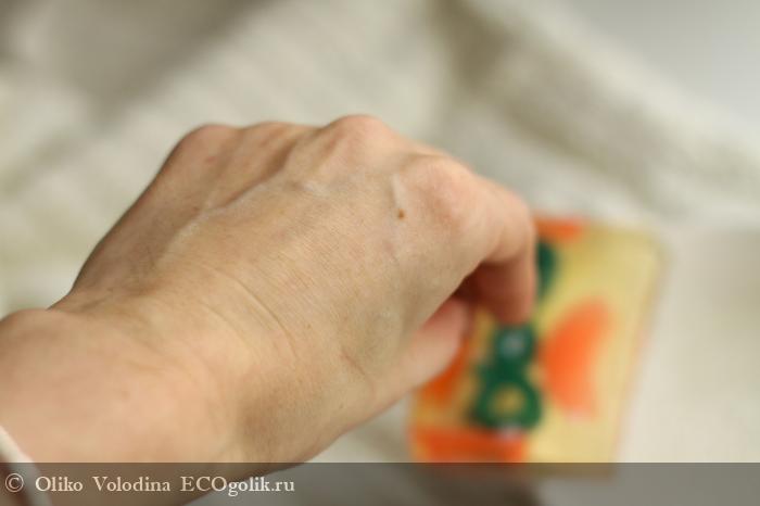 Мыло очень мягкое по действию, одно из самых мягких. У меня в обиходе мыло Шпайк и это о Шоколатте, так вот оно намного мягче Шпайка. Глицериновое мыло не пересушивает и похоже по эффекту очищения на деликатный гель. По деликатности очищения рук могу сравнить его с гелем Биосекур.
