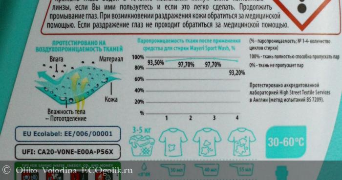 - И еще, меня как покупателя «завоевали» графики-таблички на этикетке, которые показывают исследования по выполаскиваемости средства из ткани. Протестировано в английской независимой аккредитованной лаборатории High Textile Services. У ткани сохраняются высокие свойства пропускать пар, показатели снижаются на 7- 3% .