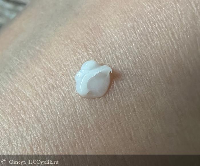 Крем легкой консистенции, он хорошо распределяется по коже и не оставляет жирного блеска.