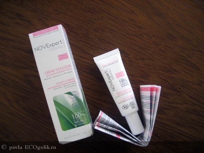 NOVExpert смягчающий крем для лица Velvety Cream для всех типов кожи (подходит для чувствительной), Франция. Объем: 30 мл. Марка имеет сертификаты: ECOCERTстандарт OrganicCosmetics и ассоциации COSMEBIO стандарт органической косметики BIO. Лаконичный дизайн био-упаковки выполнен в эко стиле. Продукт содержит растительный глицерин, масло примулы, экстракт алоэ вера, хлопка, подсолнечника, морских водорослей, граната, пребиотик и витамин Е. Бренд не использует: силиконы, минеральные масла, химические фильтры, синтетические антиоксиданты, ингредиенты животного происхождения и генетически модифицированные вещества. Белый крем плотной консистенции не обладает запахом.