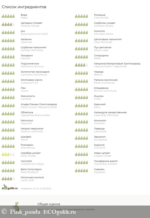 вода, ромашки вода**, цетеарил оливат**, сорбитан оливат**, масло ши**, масло семян конопли**, каламин, цетил пальмитат**, сорбитан пальмитат**, экстракт красного лука**, глицерин**, масло смородины черной**, масло семян подсолнечника*, каприлик/каприк триглицерид*, экстракт ламинарии золотистой*, экстракт череды волосистой** в хлопковом**, пальмовом** и льняном** маслах, масло клещевины**, экстракт жимолости*, инулин**, альфа-глюкан олигосахарид**, силика**, экстракт пихты*, масло облепиховое*, экстракт цветов календулы**, магнолол**, хонокиол**, левулинат натрия**, экстракт лаванды*, экстракт шалфея**, экстракт побегов эвкалипта*, экстракт розмарина**, пудра куркумы*, цитрат серебра**, цитрат меди**, экстракт чистотела*, комплекс токоферолов*, бета-ситостерол*, сквален*, молочная кислота**