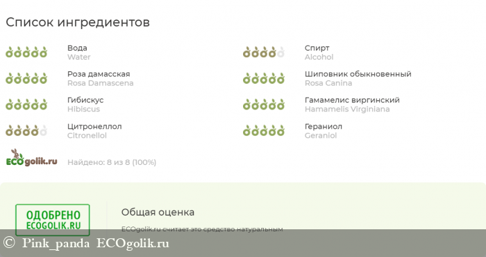 Сначала меня смутил спирт на втором месте в составе, но здесь сработал авторитет марки и их отношение к своей продукции, философия бренда вообще. Я не технолог, но предполагаю, что этот спирт необходим для консервации, помогает проникать активным компонентам внутрь кожи, также служит фиксатором аромата, а здесь он прекрасный, также имеет бактерицидное, противовоспалительное, противогрибковое действие.