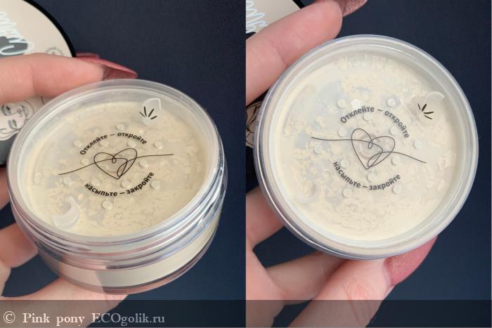 - Упаковка. Красивое оформление. Внутри есть дозатор, который можно повернуть, чтобы пудра высыпалась, и повернуть обратно, чтобы дырочки закрылись.