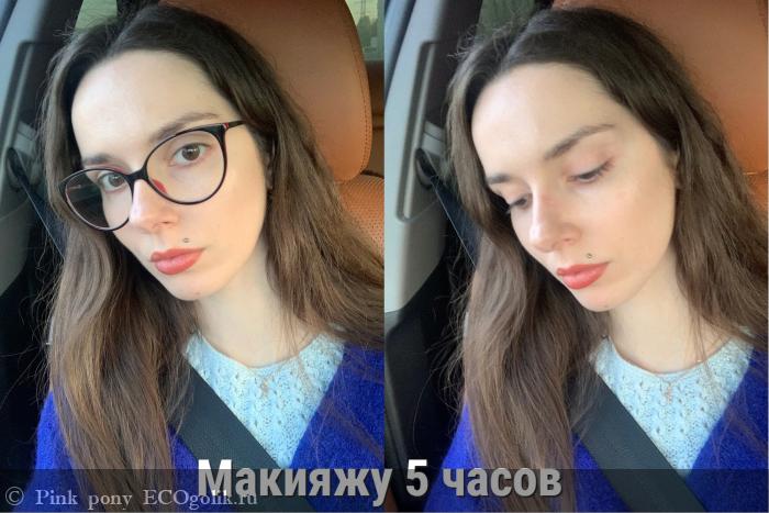 Тут в целом тоже всё хорошо, но на носу ползет макияж от очков. Это нормально, только это сложно подправить. Тут и к тональному средству вопросы есть конечно:D Вот спустя 5 часов самое лучшее, что я могу сделать, это не трогать лицо руками! Иначе начнется кошмар, пока я не трогаю, ничего сильнее не расползется.