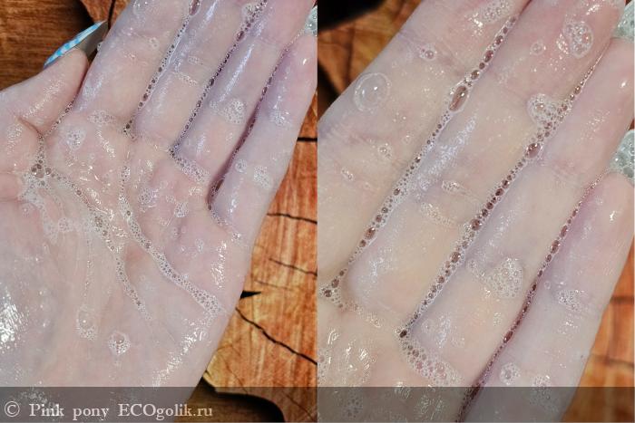 Средство отлично распределяется по коже, пенится мягко и в достаточном количестве. Смывается полностью, не оставляя липкости, жирности и маслянистости.
