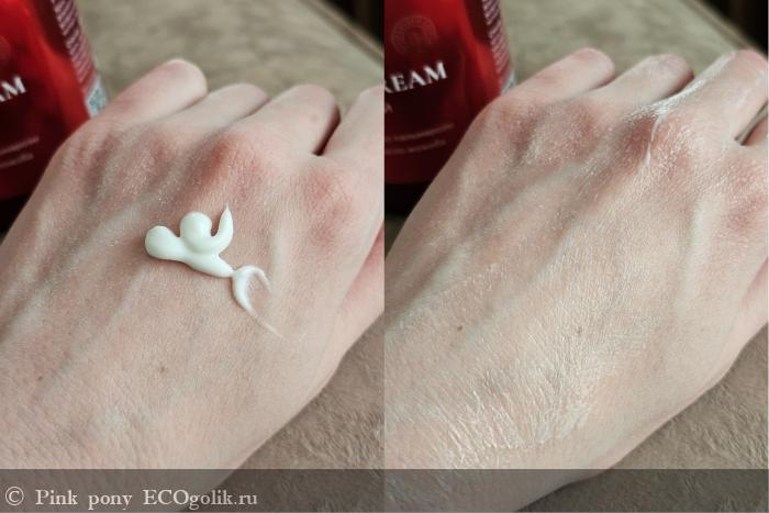 По текстуре крем в меру плотный, но не слишком тяжелый. Он хорошо распределяется по коже, не скатывается и быстро впитывается.