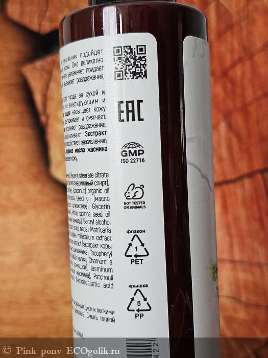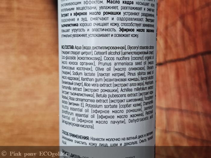 Aqua (вода дистиллированная), Glyceryl stearate citrate (глицерил стеарат цитрат), Cetearyl alcohol (цетилстеариловый спирт), Coco-glucoside (кокоглюкозид), Cocos nucifera (coconut) organic oil (масло кокоса органик), Prunus armeniaca seed oil (масло абрикосовых косточек), Olive oil (масло оливковое), Glycerin (глицерин растительный), Sodium lactate (лактат натрия), Pinus sibirica seed oil (масло кедровое), Xanthan gum (ксантановая камедь), Benzyl alcohol (бензиловый спирт), Aloe vera extract (экстракт алоэ вера), Matricaria chamomilla extract (экстракт ромашки), Achillea millefolium extract (экстракт тысячелистника), Betula pubescens extract (экстракт коры березы), Rosa cinnamomea extract (экстракт шиповника), Tocopheryl acetate (витамин Е), Potassium sorbate (сорбат калия), Chamomilla recutita essential oil (эфирное масло ромашки), Jasminum grandiflorum essential oil (эфирное масло жасмина), Patchouli essential oil (эфирное масло пачули), Dehydroacetic acid (дегидроуксусная кислота).