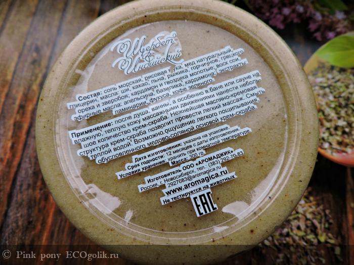 Линейка скрабов идет на меду, у этого скраба скрабирующими частичками является соль, рисовая мука, молотый кардамон и гвоздика. Мне очень нравится, что тут молотые специи! Это так необычно и классно. Хотя скрабирующая основа и разная, но жесткость и текстура у щербетов примерно одинаковая. А сколько тут эфирных масел! Апельсин, базилик и кардамон! Тут такой многогранный аромат, что его безумно сложно описать. А какое у него действие на эмоциональное состояние! А какие шикарные свойства, вы только посмотрите. Основная направленность скраба от целлюлита и для улучшения тонуса и упругости кожи.