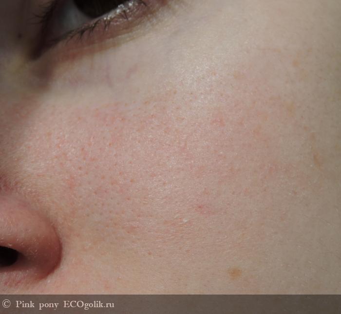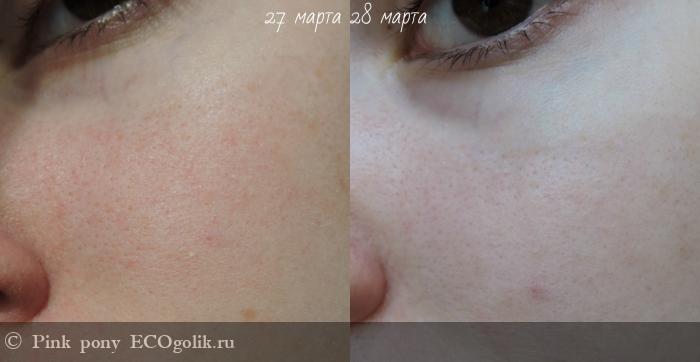 В отзывах я читала, что маска сильно жжет кожу, я очень боялась этого, но такого не было. Однако, в этот раз (что я сфотографировала) маска действительно начала местами холодить кожу, слегка щипала, но это всё прекратилось в течении минуты, я думаю так вышло из-за того, что кожа сильно чувствительная стала и была повреждена, потому что до этого такого не было, либо еще повлияло то, что я взяла слишком много маски, до этого я наносила её почти как крем, тонким слоем распределяла по коже и всё. Эффект одинаковый, так что не надо брать много маски.