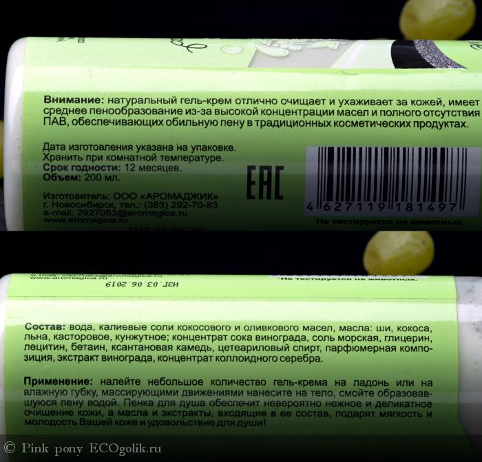Аромат, это отдельная песня, хоть это и парфюмерная композиция, но как она вкусно пахнет! Аромат очень свежий, с приятной кислинкой, кажется, что перед тобой реальный виноград, при первом же вдохе появляется чувство радости. При использовании геля аромат стоит на всю ванную комнату, но и это не все, для меня было очень радостным открытием, что аромат ещё и держится на коже! Это очень круто, не помню гелей, которые имели бы такой же стойкий аромат.