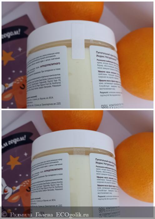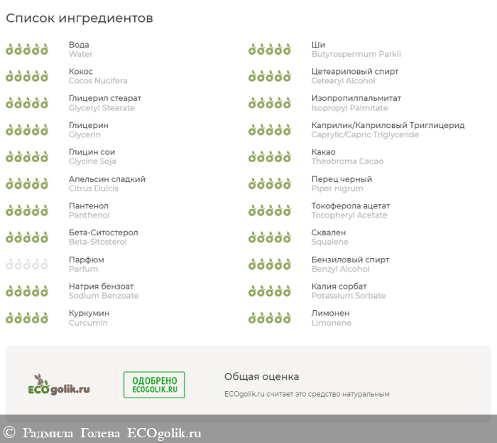 Aqua (Вода), Butyrospermum Parkii Butter (Масло ши баттер), Cocos Nucifera Seed Butter (Масло-баттер кокоса), Cetearyl Alcohol (Цетеариловый спирт), Glyceryl Stearate (Глицерил стеарат), Isopropyl Palmitate (Изопропилпальмитат), Glycerin (Глицерин), Caprylic/Capric Triglyceride (Каприлик/каприк триглицериды), Glycine Soja Oil (Масло соевое), Theobroma Cacao Seed Butter (Масло-баттер какао), Citrus Aurantium Dulcis Oil (Эфирное масло сладкого апельсина), Piper Nigrum Fruit Oil (Эфирное масло чёрного перца), Panthenol (Пантенол / провитамин B5), Tocopherol, (Токоферол / витамин Е), Beta-Sitosterol (Бета-ситостерол), Squalene (Сквален), Parfum (Отдушка), Benzyl Alcohol, Sodium Benzoate, Potassium Sorbate (Бензиловый спирт, натрия бензоат, калия сорбат / консерванты, разрешённые по стандарту COSMOS для производства органической косметики), Curcumin (Куркумин / натуральный краситель), Limonene (Лимонен / компонент эфирных масел)