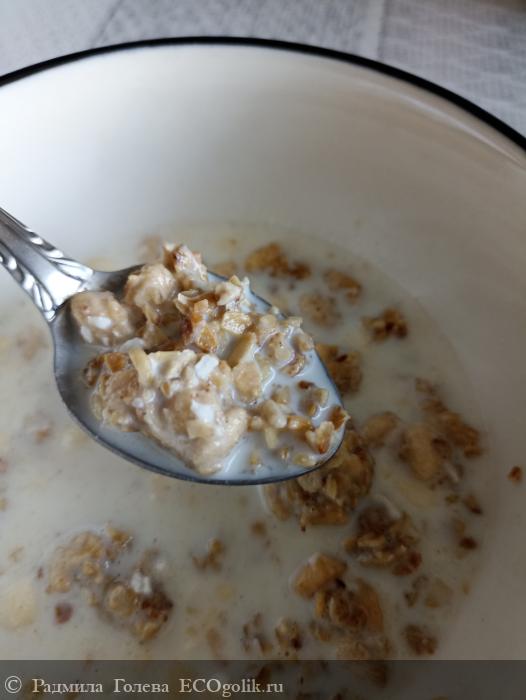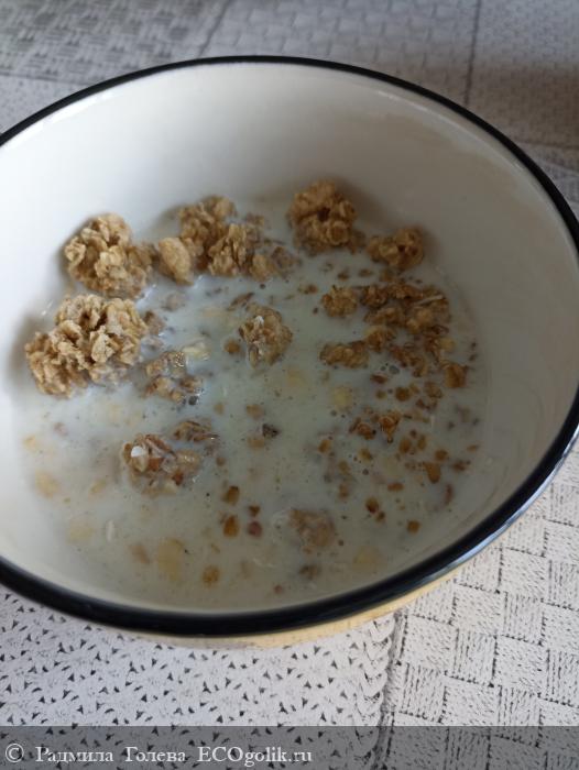 Я люблю её именно с молоком. Пробовала с йогуртом, получалось для меня сладковато. А вот с молоком очень неплохо, сладость гранолы и молока перемешиваются и дополняют друг друга, получается гармоничный вкус.