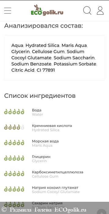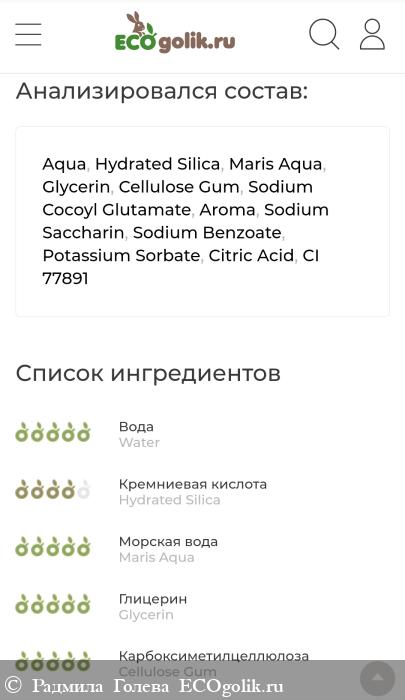 Aqua, Hydrated Silica, Maris Aqua, Glycerin, Cellulose Gum, Sodium Cocoyl Glutamate, Aroma, Sodium Saccharin, Sodium Benzoate, Potassium Sorbate, Citric Acid, CI 77891.