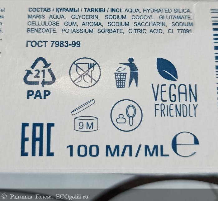 Упаковка зубной пасты выглядит привлекательно и современно. Паста помещена в белую картонную коробку, название выполнено крупными буквами в стильном цвете тиффани. На упаковке указан полный перечень ингредиентов, маркировки , которые доказывают эффективность данного продукта.