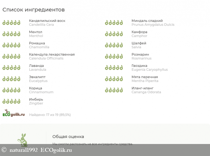 воск канделильский, масло миндальное, кариофиллен натуральный, ментол, камфора, экстракты лаванды, розы, ромашки, шалфея, календулы, розмарина и мяты, эфирные масла лаванды, гвоздики, эвкалипта, мяты, корицы, иланг-иланга и имбиря.