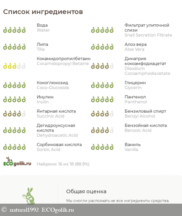 Активный компонент пенки муцин улитки стоит уже на втором месте, сразу после воды, а значит его концентрация в составе очень высокая, меня этот факт очень обрадовал.