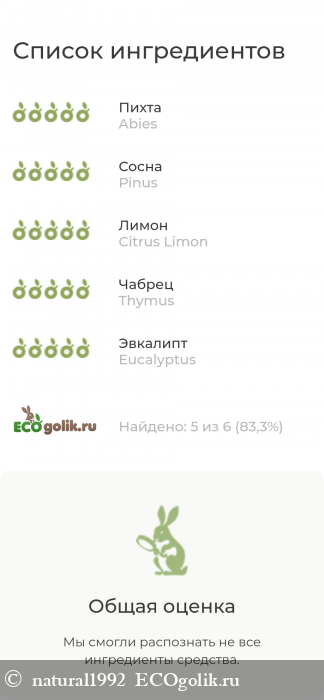 Сервис проверки не распознал только эфирное масло мелиссы. Это полностью натуральный и безопасный компонент, который имеет полностью растительное происхождение. Состав у данного комплекса отличный. Нет консервантов, силиконов, парабенов, минерального масла и красителей. Зато помимо мелиссы есть: